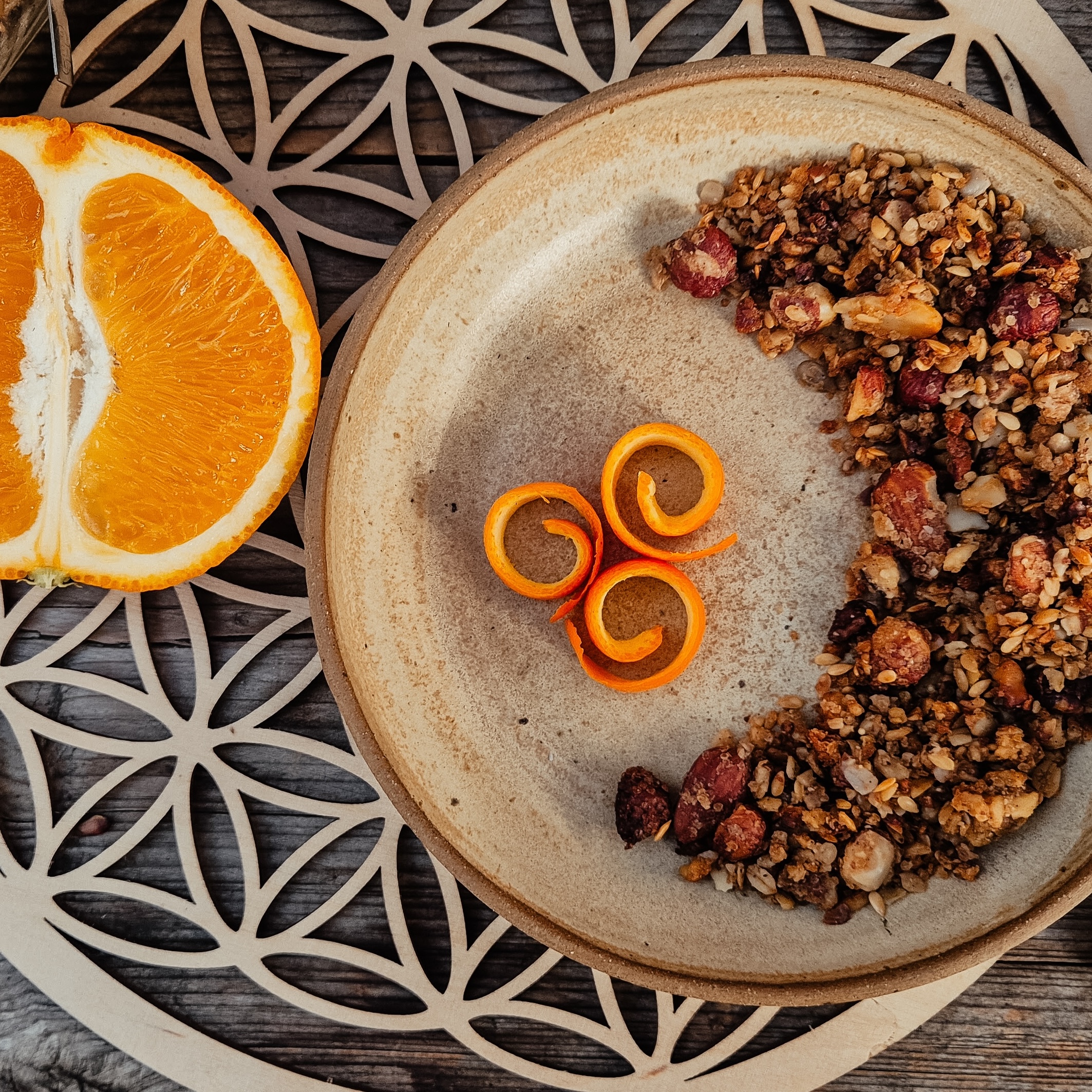 Dieses fein abgestimmte Granola vereint wärmende, nährende Zutaten – ideal für die besondere Zeit des Wochenbetts. Honig, Nüsse und Goldleinsaat stärken dich, geben Energie, unterstützen die Regeneration und werden durch die Röstung leichter verdaulich. Sonnenblumenkerne und Amaranthpops sorgen für Leichtigkeit, während Olivenöl, Vanille und die natürliche Süße von Orangensaft und Orangenöl das Granola harmonisch abrunden und dein Verdauungsfeuer (Agni) sanft anregen. Ob als Topping zu deinem warmen Porridge, als feiner Crunch auf einer Cremesuppe oder pur als schneller Energieschub zwischendurch – ein wohltuender, vielseitiger Allrounder für Körper und Seele im Wochenbett.
